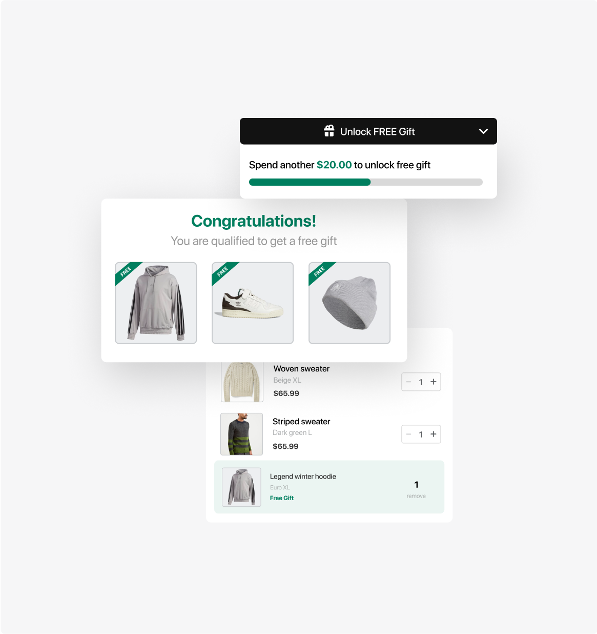 This functionality allows your store to automatically add free gifts to a customer's cart when they meet specific conditions and remove them if those conditions are no longer satisfied.